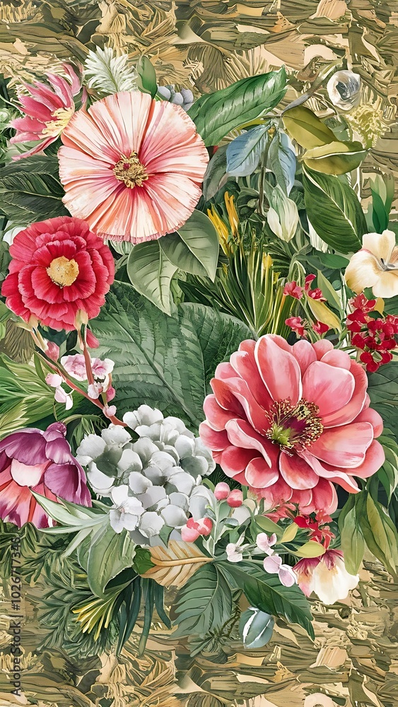 Delicate, Detailed Floral Arrangement Of Pink Blossoms, Accented By Deep Crimson Centers, And Dark Green Leaves.