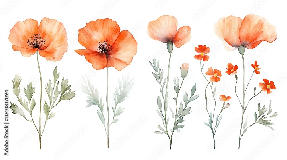 Watercolor Illustration Of Four Orange Poppies With Green Wallpaper Mural - Decorly Solutions | Decorly Solutions