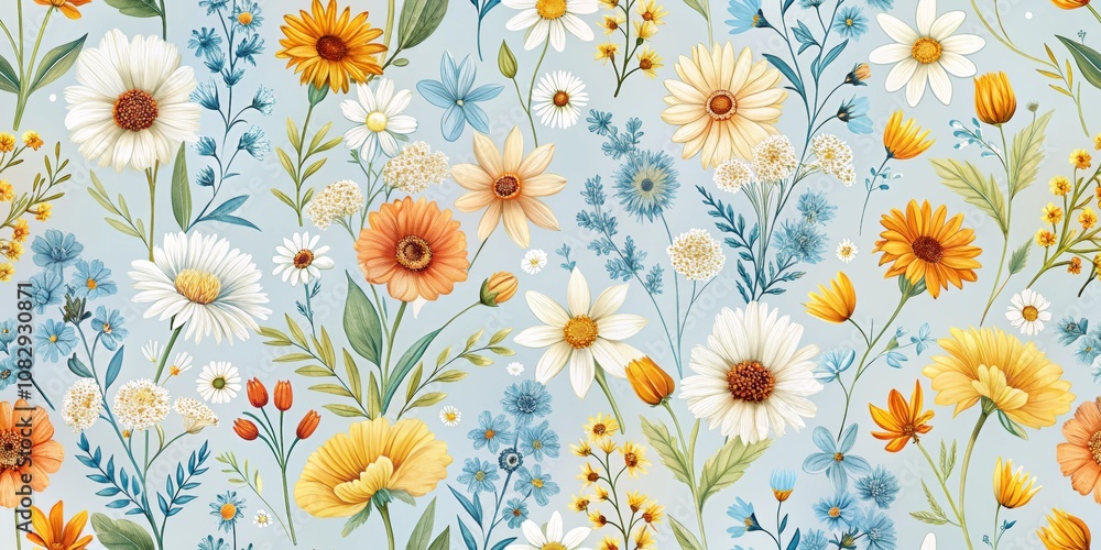 Watercolor Floral Pattern With Daisies Yellow Blue And Wallpaper Mural - Decorly Solutions | Decorly Solutions