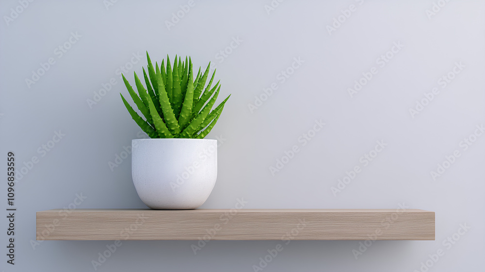 Interior design banner with minimalist houseplant on white shelf, soft background