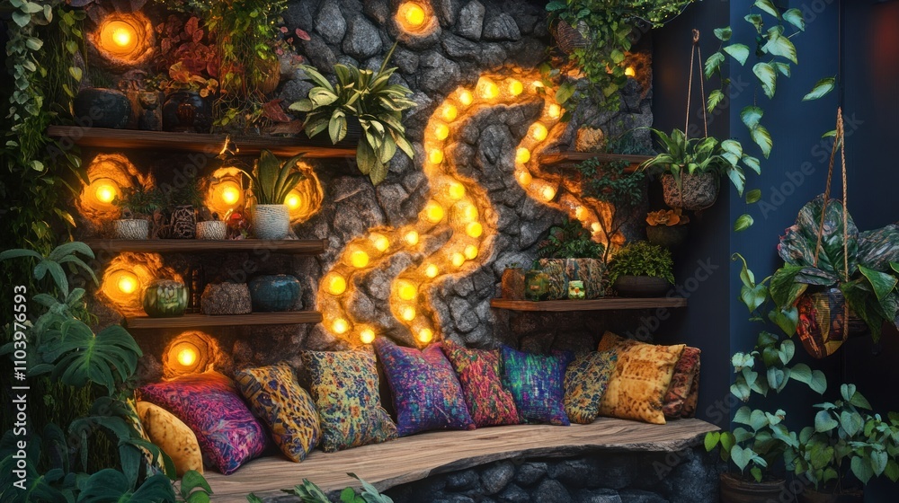 Cozy Stone Bench With Pillows Plants And Warm Wallpaper Mural - Decorly Solutions | Decorly Solutions
