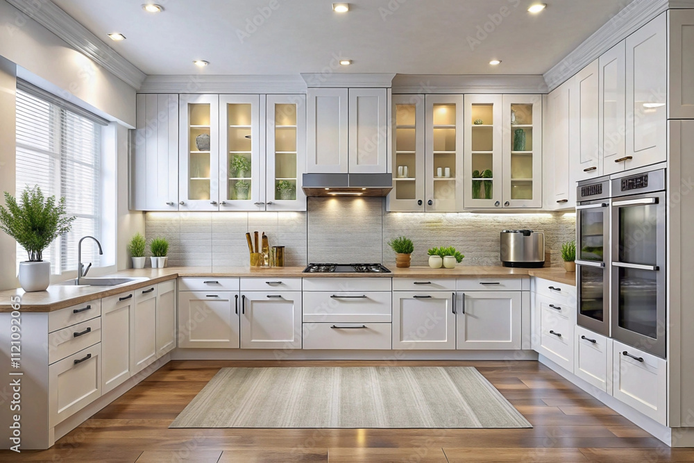 Modern White Kitchen With Hardwood Floors Glass Cabinets Wallpaper Mural - Decorly Solutions | Decorly Solutions