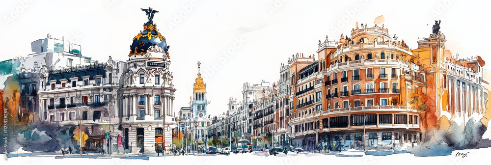Watercolor Madrid Cityscape Gran Via Elegance - Vibrant Wallpaper Mural - Decorly Solutions | Decorly Solutions