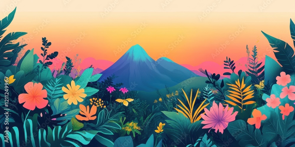 Vibrant Tropical Flowers Blooming Before Majestic Mountains Sunset
