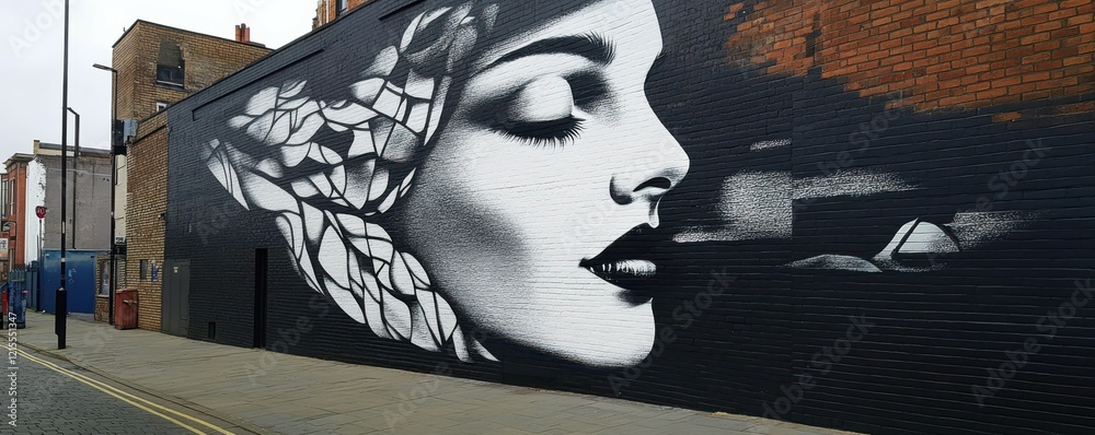 Artistic urban mural transformation: black and white graffiti on brick wall