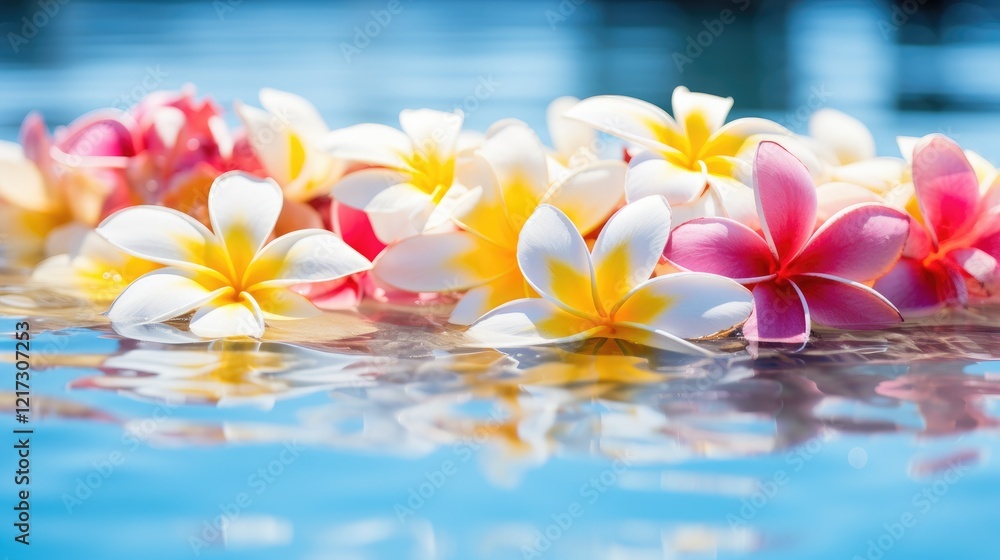 water surface with floating plumeria flowers and reflections on sunny day, tropical vacation background