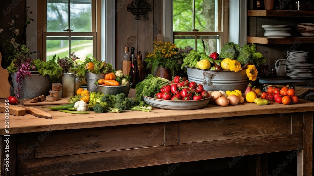 Colorful Fresh Produce Displayed Untidy Kitchen Full Life Flavor, Vegetables, Fruits, Herbs, Spices, Organic, Seasonal, Local, Ingredients, Cooking
