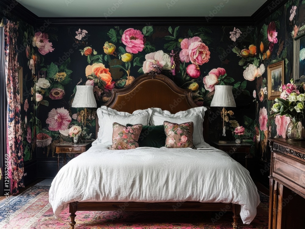 A Large Bed With A Floral Wallpaper And Wallpaper Mural - Decorly Solutions | Decorly Solutions