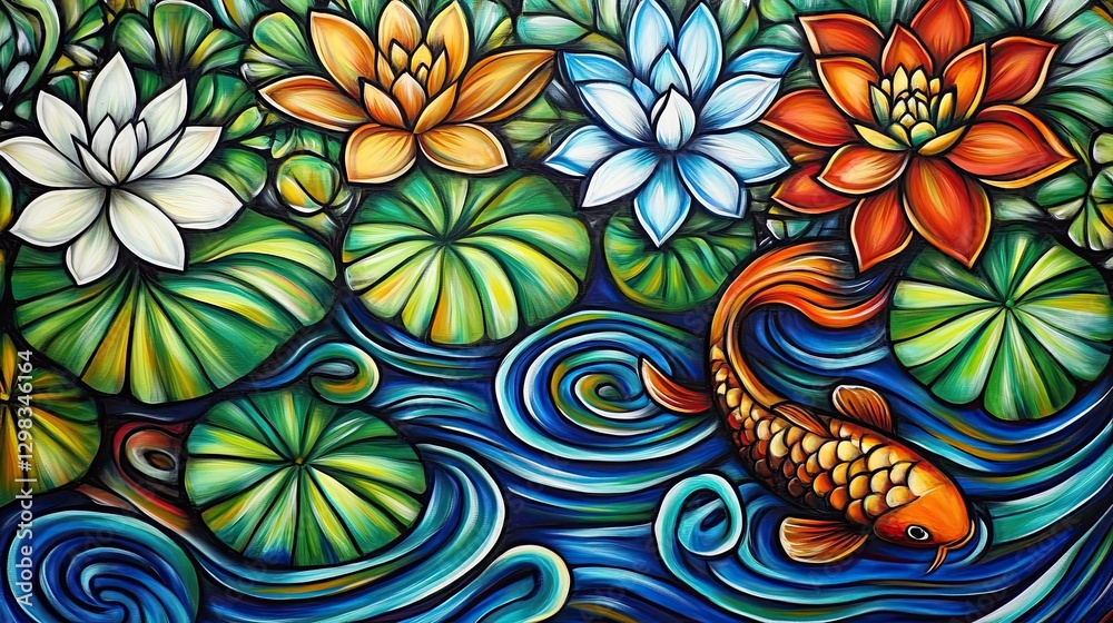Colorful Lotus Pond Mural With Koi Fish Wallpaper Mural - Decorly Solutions | Decorly Solutions