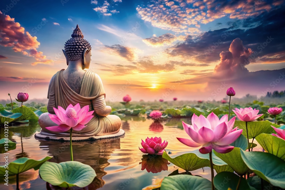 Serene Buddha Statue With Lotus Flower Panoramic Landscape Wallpaper Mural - Decorly Solutions | Decorly Solutions