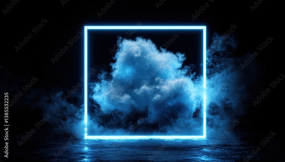 Surreal Digital Scene Featuring A Glowing Blue Cloud Suspended Within A Bright Neon Square On A Dark Background, Evoking Futuristic Concepts.
