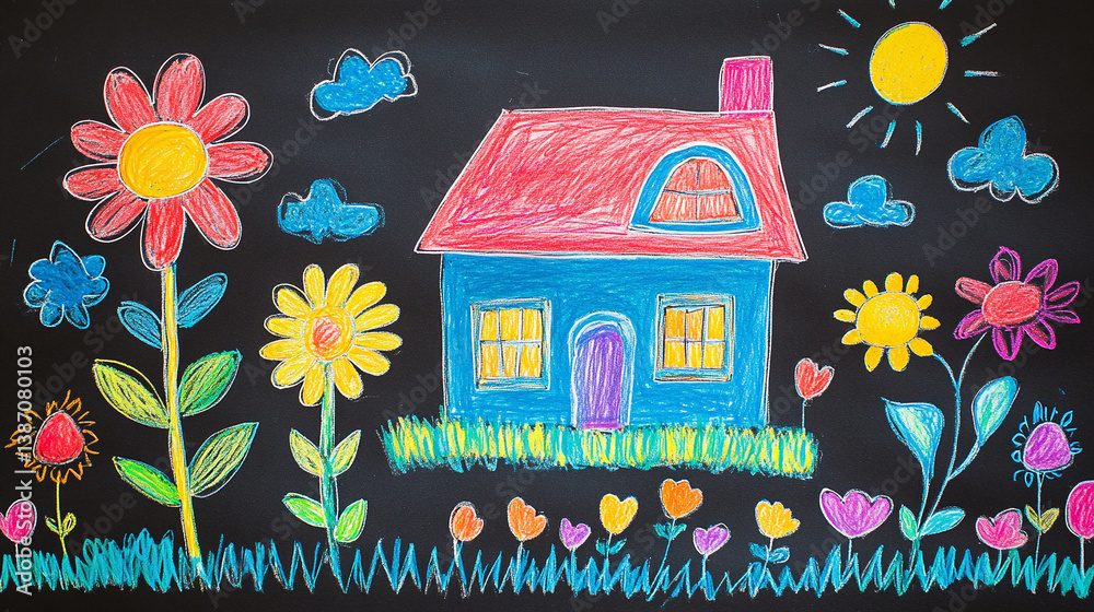 Child's drawing of a house with a garden Wallpaper