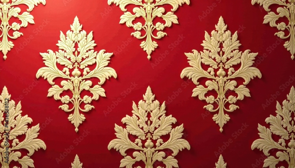 Crimson damask wallpaper, opulent floral details, decorative, brocade, background