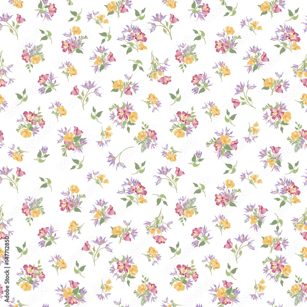 Vector illustration of a seamless floral pattern with spring flowers. Lovely floral background in sweet colors.Design for banner, poster, card, invitation and scrapbook