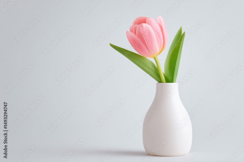 Simple White Vase With Single Blooming Pink Tulip Stands Gracefully On Clean White Surface Casting Soft Shadow Beneath