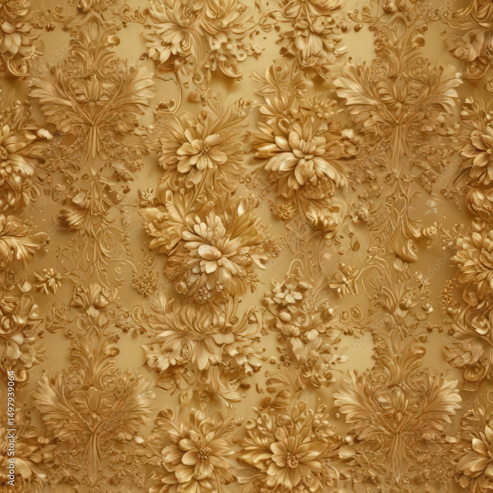 Golden damask pattern with ornate leaves and delicate flower Wallpaper
