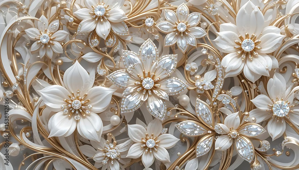 Elegant white flowers with gold accents and crystal embellishments in luxurious 3D style. Perfect for wedding decor, luxury branding, or background designs.