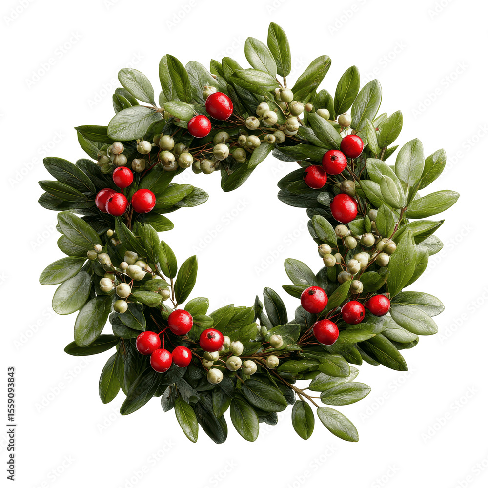 A decorative wreath featuring green leaves and red berries, ideal for festive occasions.