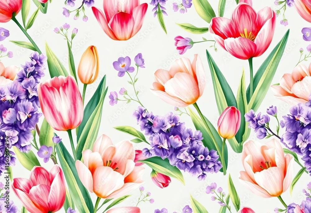 Horizontal Watercolor Floral Pattern Featuring Tulips And Lilacs Wallpaper Mural - Decorly Solutions | Decorly Solutions