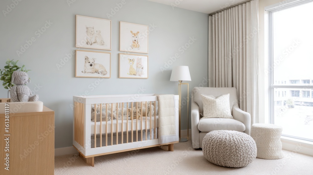 Elegant nursery design featuring pastel-colored walls, a pink armchair, white crib, and soft curtains. Bright and serene.