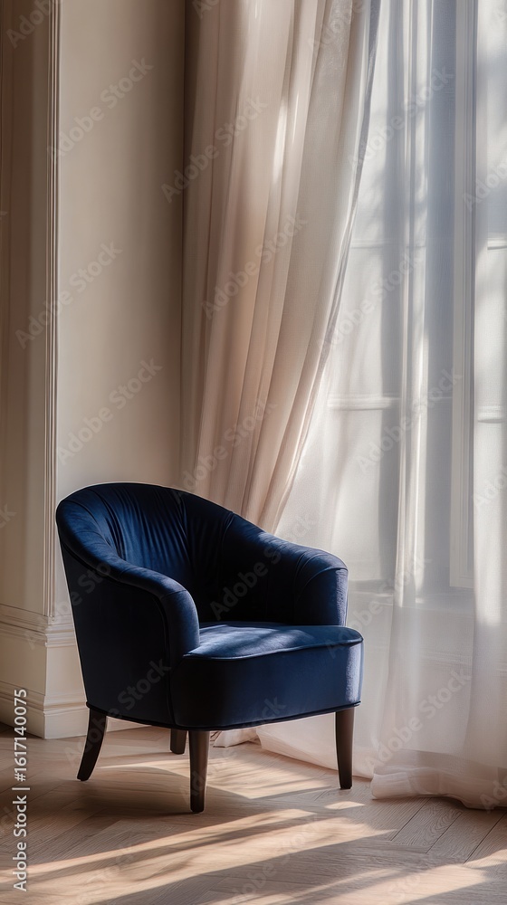 A Deep Blue Upholstered Armchair Positioned In A Wallpaper Mural - Decorly Solutions | Decorly Solutions