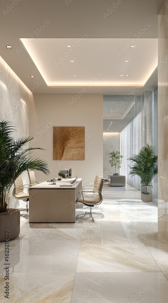 Modern beige office interior with marble floors and plants Wallpaper