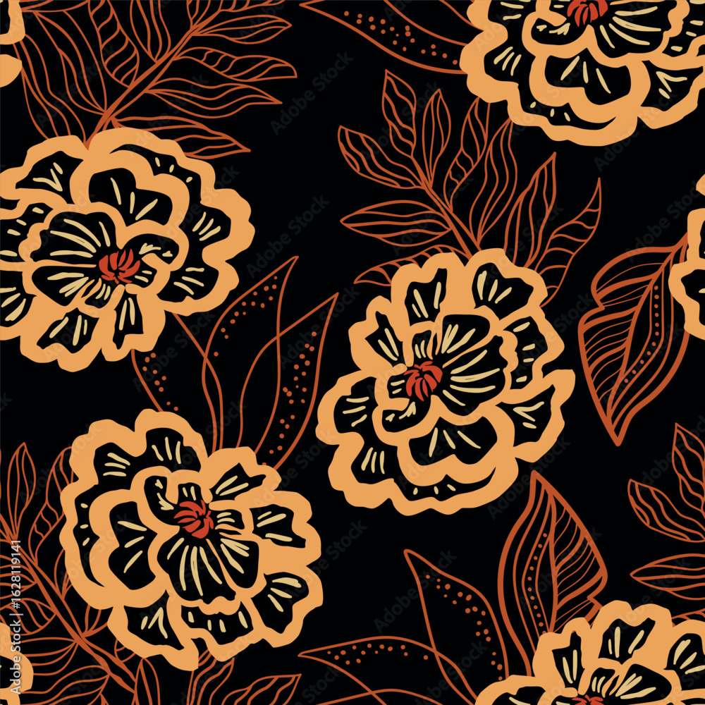 A floral pattern with orange and green flowers on a dark background.