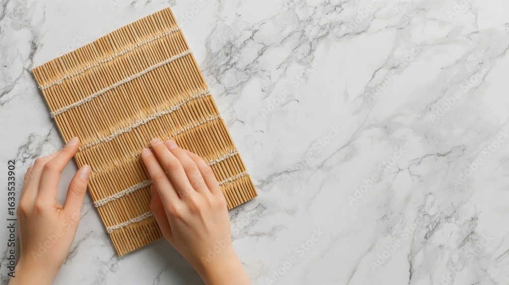 Hands Gently Holding A Light Beige Woven Bamboo Wallpaper Mural - Decorly Solutions | Decorly Solutions