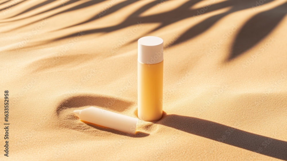 Cream Bottle And Tube On Light Beige Sand Wallpaper Mural - Decorly Solutions | Decorly Solutions