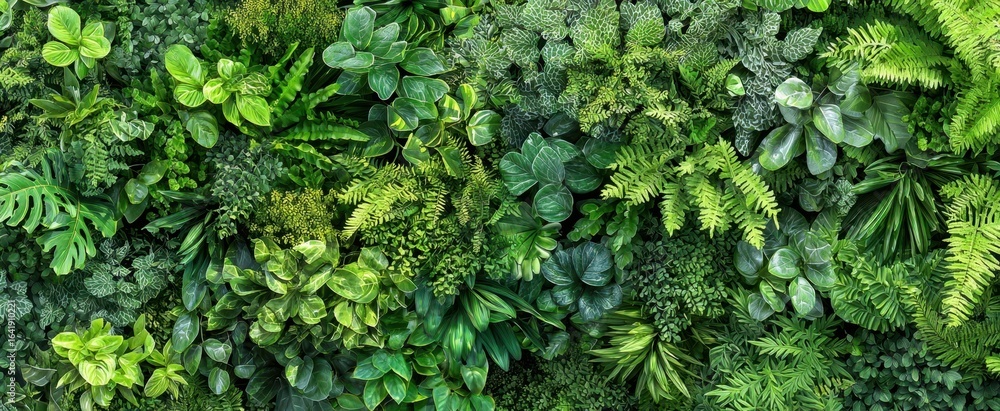Dense green foliage background with various leaves and textures creating a natural wall.