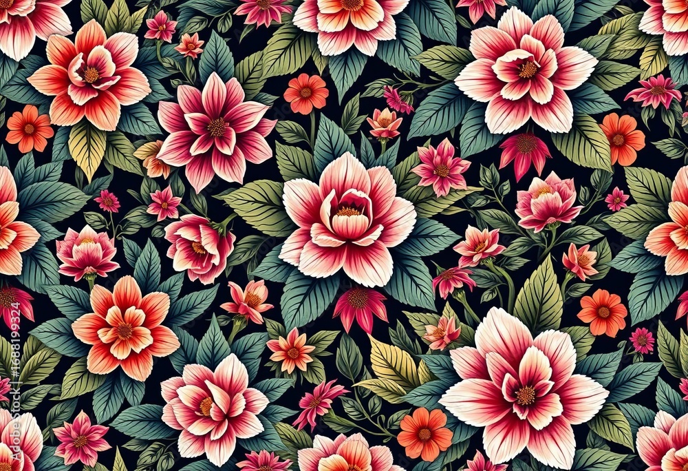 Intricate repeating floral pattern lush blooms & leaves in s Wallpaper