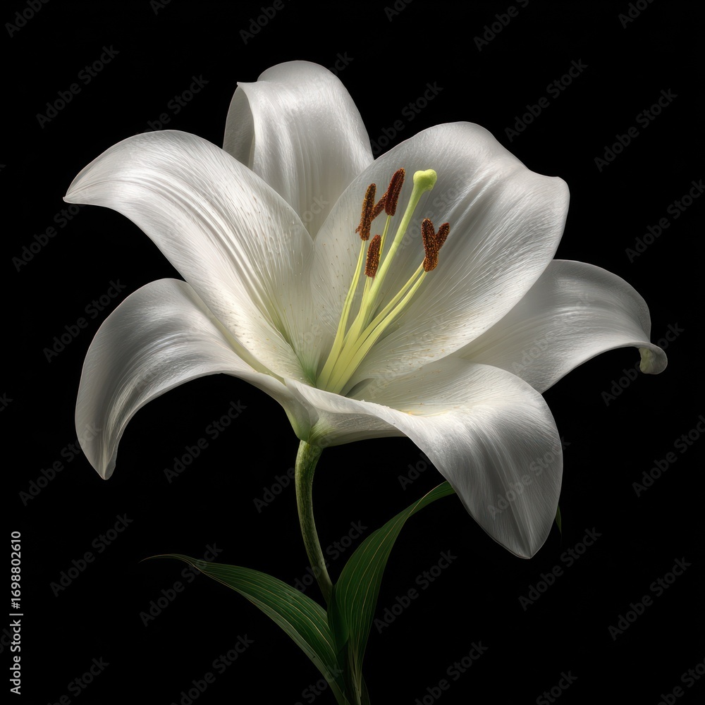 Elegant Easter Lily Blossom With Gently Curved Petals And Prominent Yellow Stamen Presented On A Soft White Background Conveying Spring Renewal