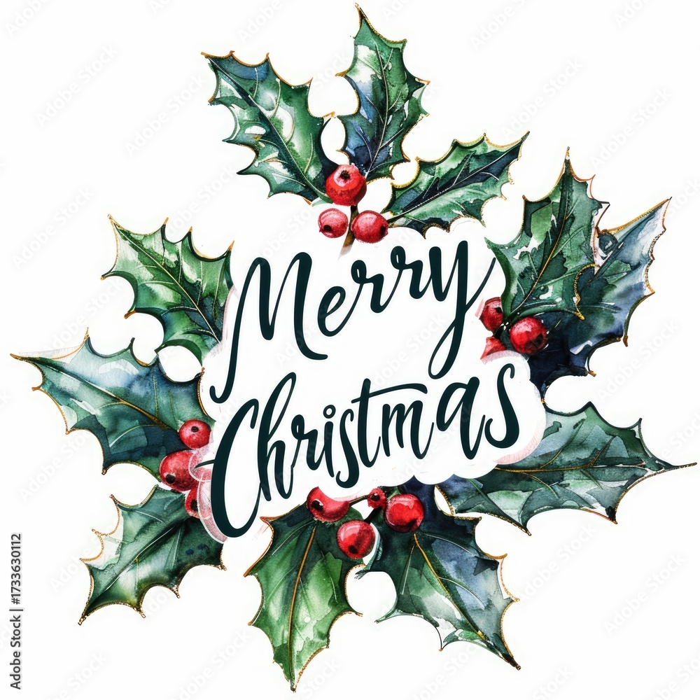Merry Christmas Watercolor Holly Wreath Wallpaper Mural - Decorly Solutions | Decorly Solutions