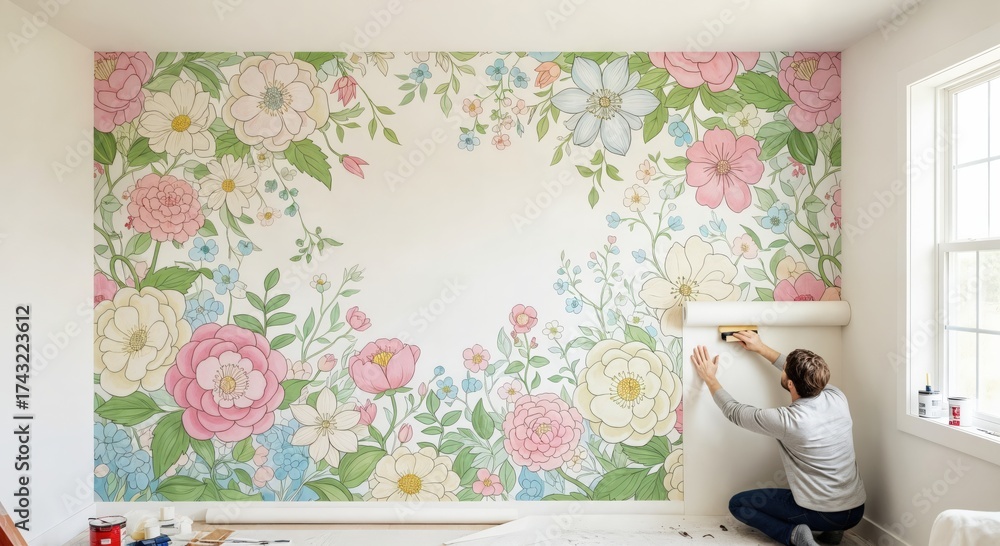 Man installing vibrant floral with large pink and yellow flo Wallpaper