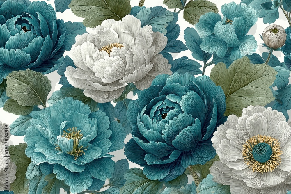Teal blue floral pattern with oversized poppies for vintage fabric, wallpaper, and decor projects inspiration
