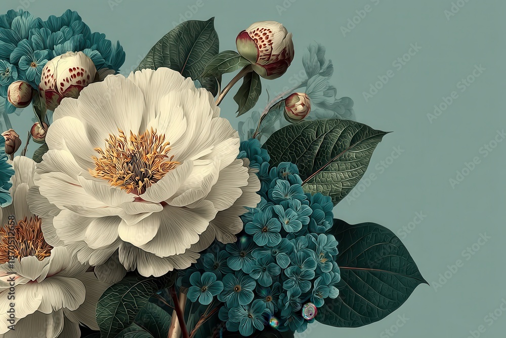 Elegant Floral Design With Large White Peonies Blue Wallpaper Mural - Decorly Solutions | Decorly Solutions