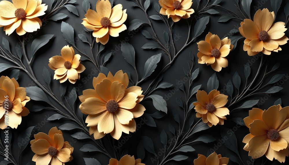 Golden yellow flowers with dark grey leaves on black backgro Wallpaper