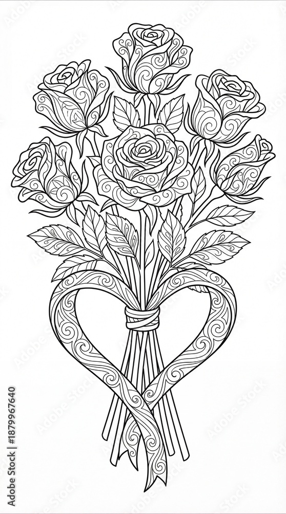 Line Art Bouquet Of Roses With Ribbon Flowers Floral