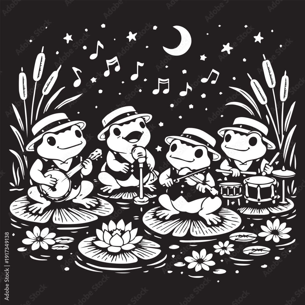 A playful vector art of four cute frogs forming a band on li Wallpaper