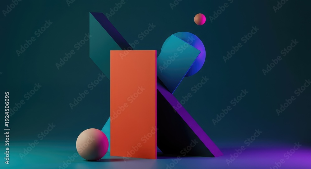 A surreal composition of floating geometric shapes in vibrant neon colors against a black background