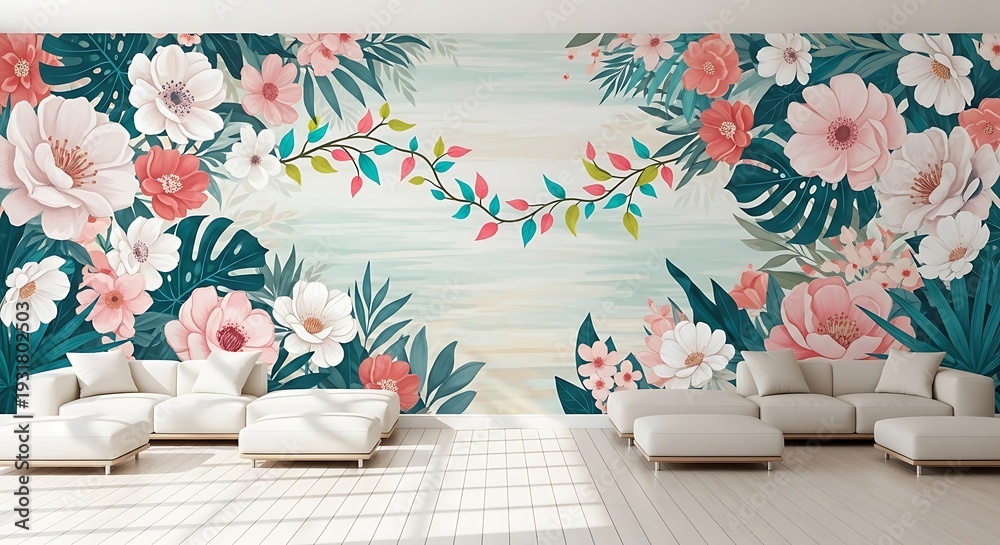 Modern Living Room With Vibrant Floral Wallpaper Mural Wallpaper Mural - Decorly Solutions | Decorly Solutions
