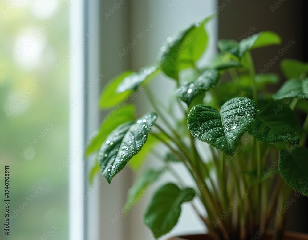 Green houseplant with water droplets on its leaves sits near Wallpaper
