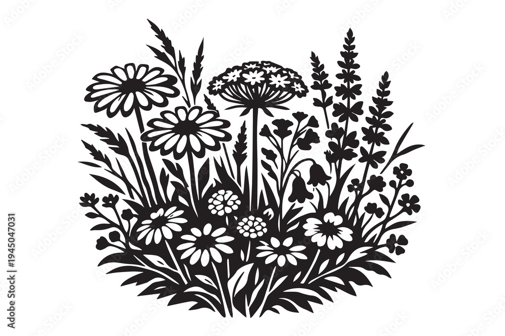 Botanical Illustration Featuring Various Herbs And Flowers In Black