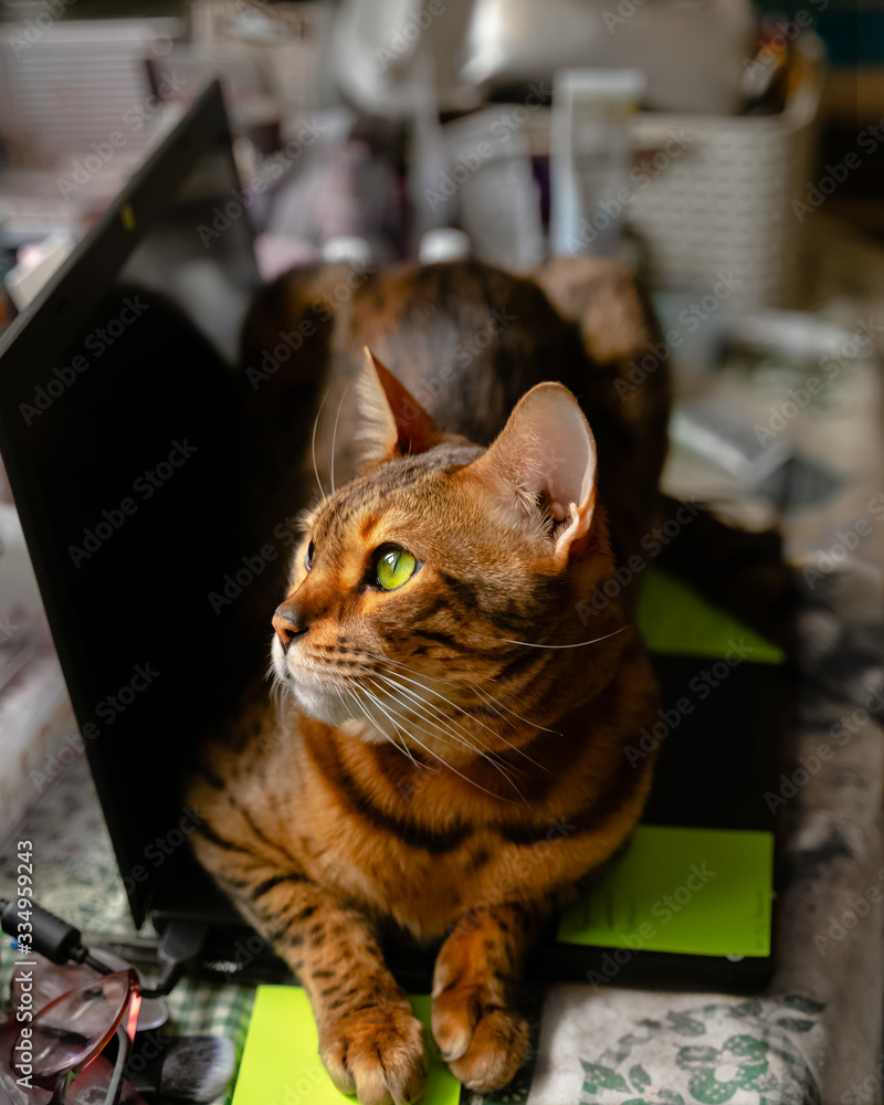 Bengal cat lying on laptop computer. Working from home with pets concept
