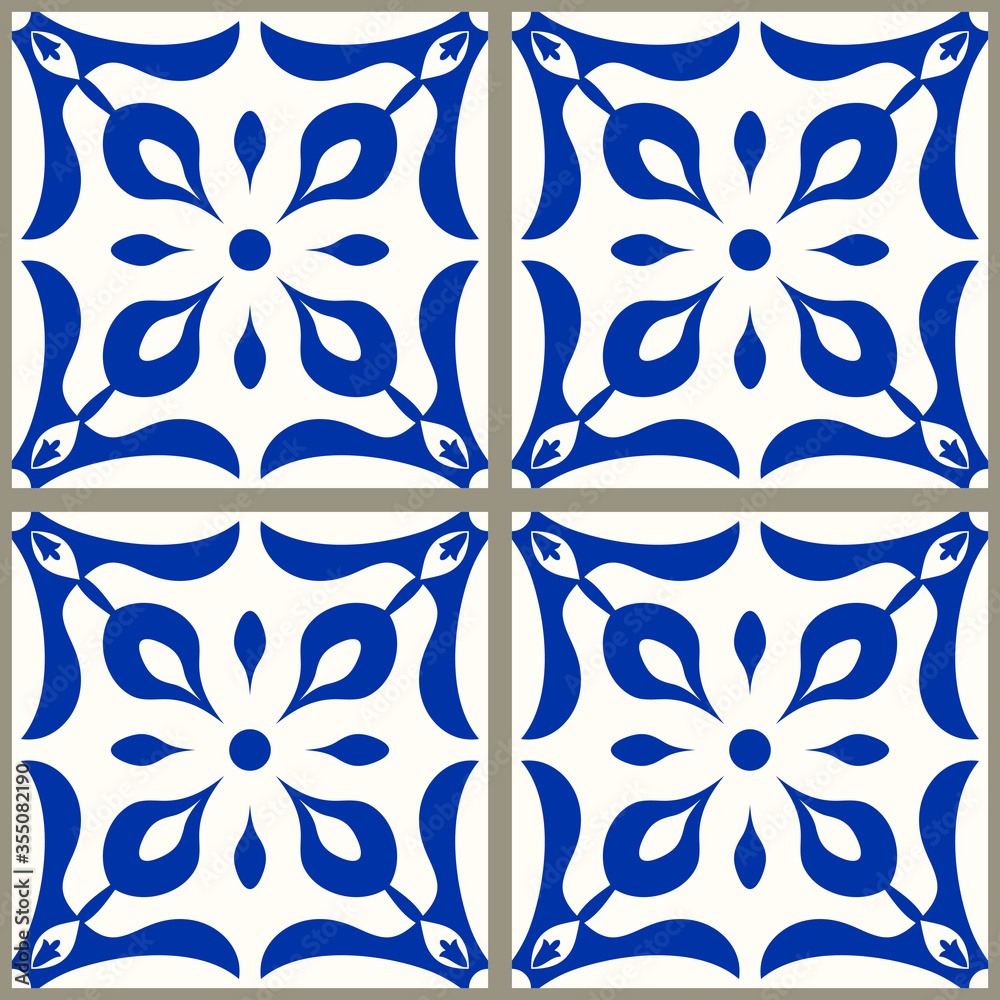 Set of tiles Azulejos in blue, white. Original traditional Portuguese and Spain decor. Seamless patchwork tile with Victorian motives. Ceramic tile in talavera style. Gaudi mosaic. Vector