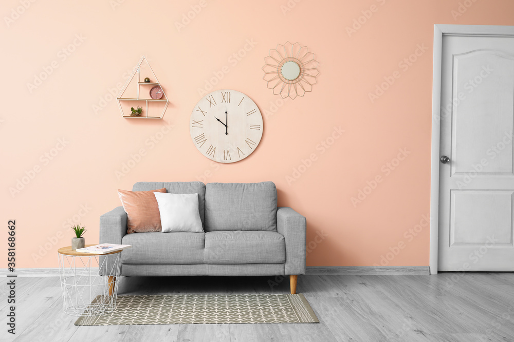 Stylish Sofa Near Color Wall In Room Wallpaper Mural - Decorly Solutions | Decorly Solutions