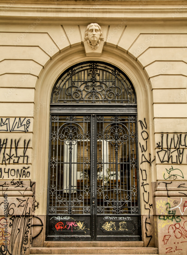 an old stone building has green doors and ornate designs on it