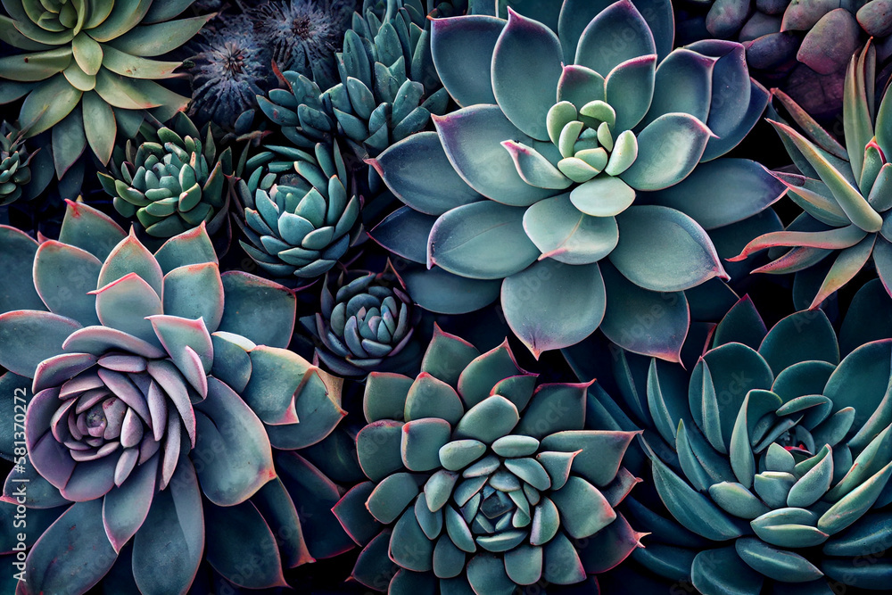 Beautiful succulent garden background with variety of echeveria plants in soft colors
