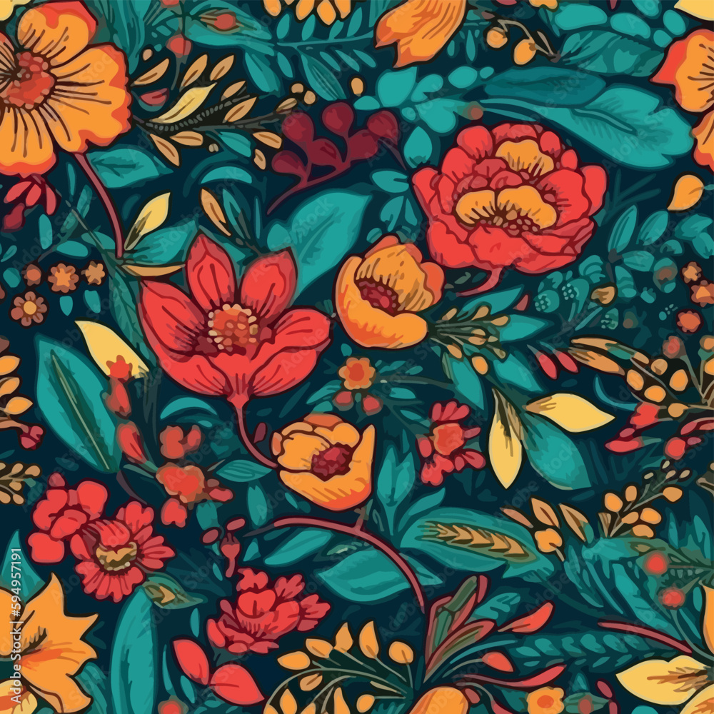 Vibrant Floral Textile Design  Golden Yellow Orange Red Flowers Seamless Pattern