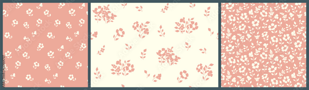 Seamless floral pattern, liberty ditsy print with cute mini plants in collection. Pretty botanical design, romantic background: small hand drawn daisy flowers, tiny leaves on a white field. Vector.